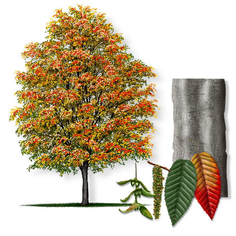 Despite its strength, this tree stays modest in stature, making it a stout option for smaller properties or when planting under power lines. The oval crown is lined with finely serrated leaves that turn warm yellow in autumn, and the bark peels in narrow, flakey strips giving it a shingled texture.